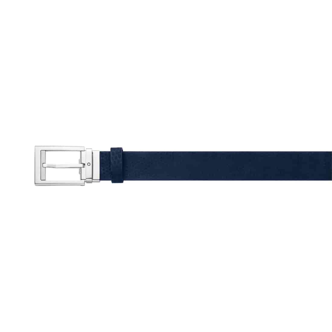 El cinturón Montblanc 128756 cuenta con correa reversible de 30 mm: un lado en piel negra granate y el otro en azul liso. Incorpora una hebilla tipo herradura con acabado brillante en paladio y memoria automática —es autoajustable hasta 3 cm— ofreciendo elegancia y versatilidad para uso formal e informal.