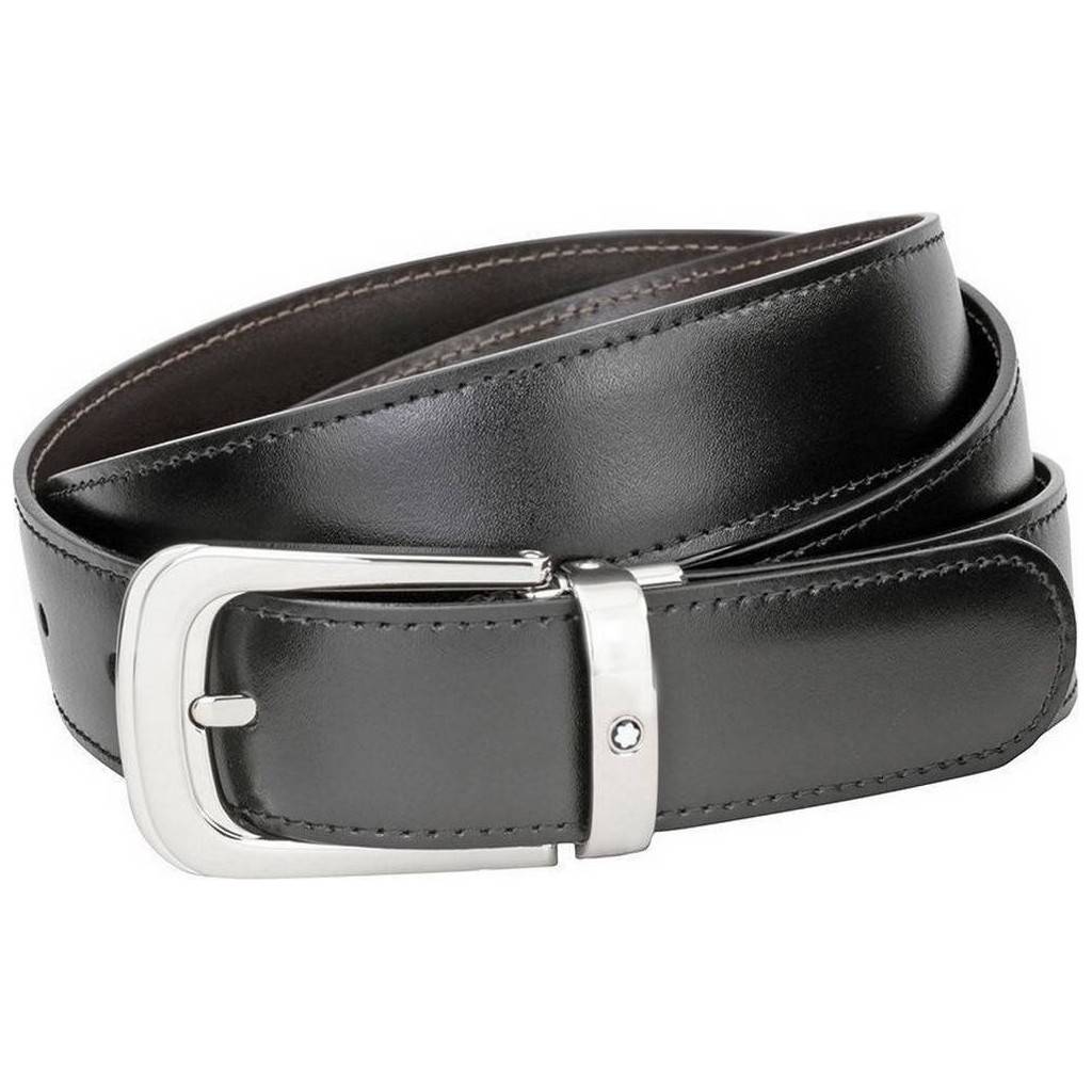 El cinturón Montblanc Contemporary 106603 es reversible, con una cara en piel negra y otra en marrón, equipado con una hebilla tipo herradura bañada en paladio y con el emblema Montblanc. Su diseño elegante y versátil permite combinarlo fácilmente tanto con atuendos formales como casuales