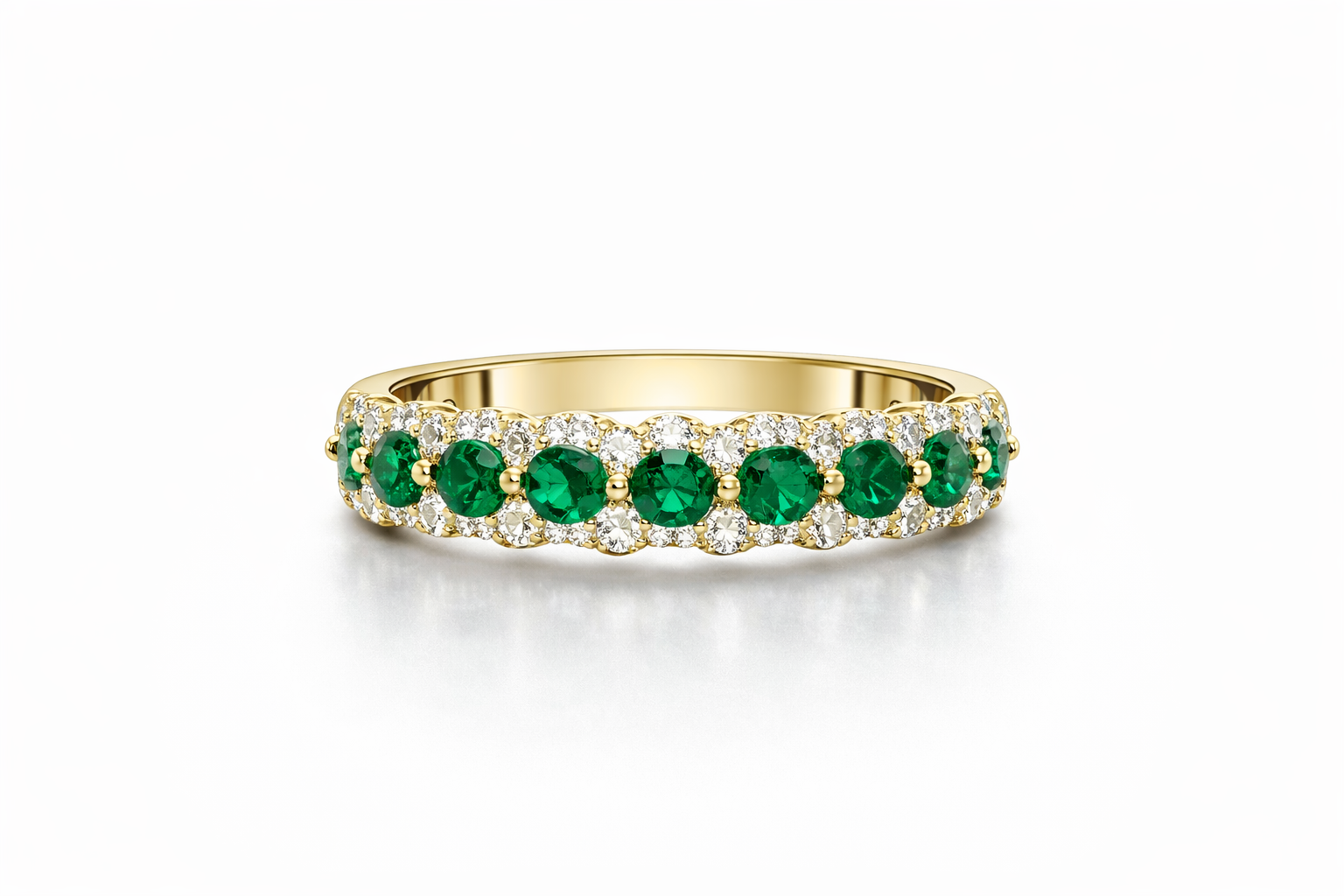 Este anillo de la colección PINETA 18K de BAUER celebra la belleza natural de las esmeraldas en un diseño tipo media eternidad que combina sofisticación y versatilidad.