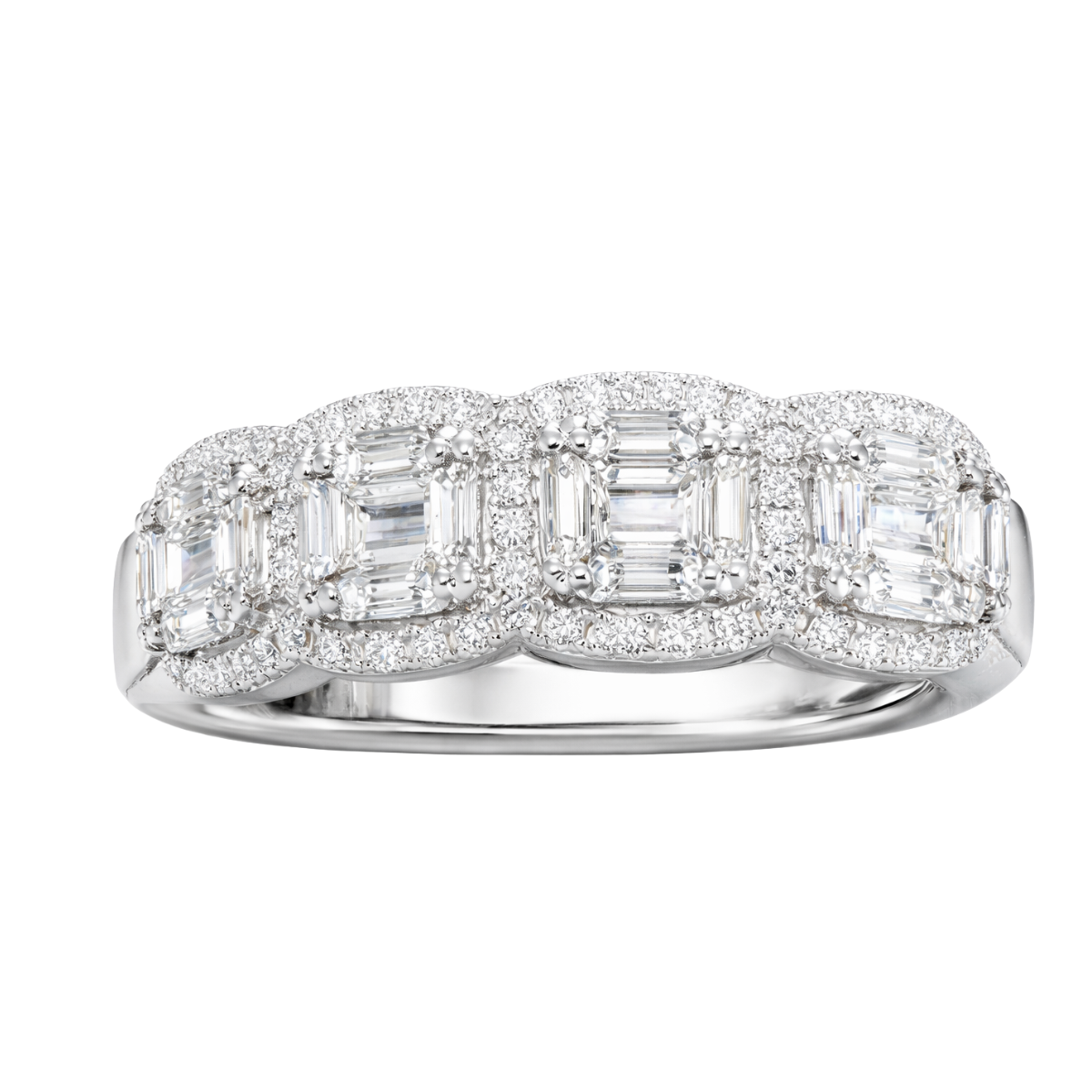 El equilibrio perfecto entre arquitectura y brillo absoluto. Este anillo de la colección PINETA 18K está elaborado en oro blanco de 18 quilates y diseñado con una estructura triple protagonista de diamantes corte baguette, cuidadosamente enmarcados por halos de diamantes redondos en pavé que amplifican su luminosidad.
