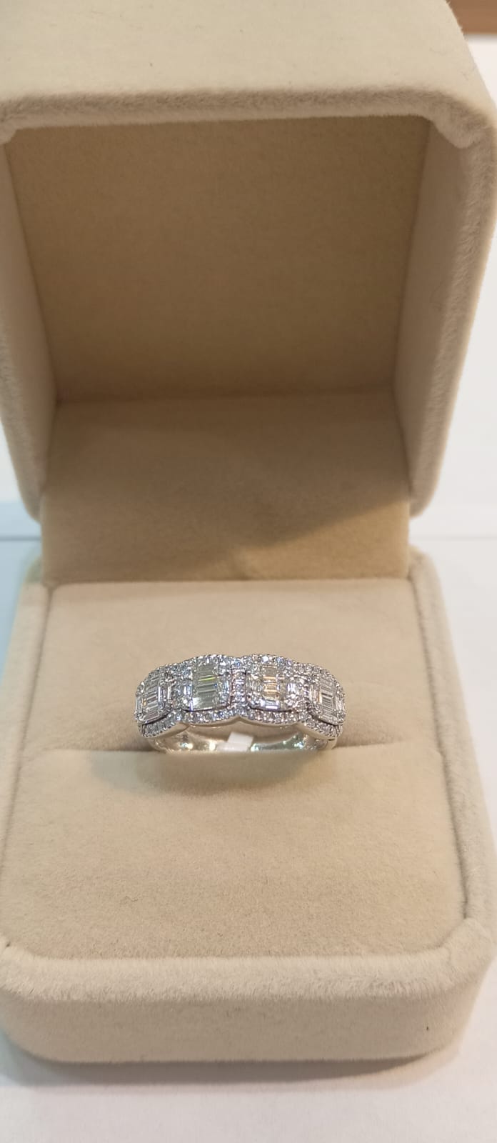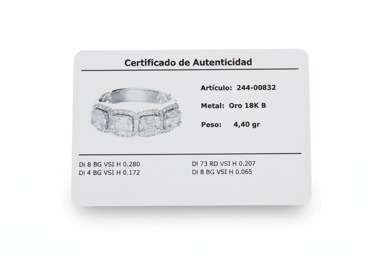 La combinación de cortes rectangulares y redondos crea un juego de luz sofisticado y contemporáneo, resaltando la pureza y el brillo de cada piedra en calidad VSI color H. Su diseño estructurado aporta carácter y elegancia, convirtiéndolo en una pieza ideal tanto como anillo de aniversario, regalo especial o statement ring de lujo.