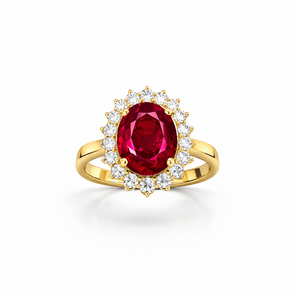 Anillo PINETA 18K con Rubí Oval y Halo de Diamantes en Oro Amarillo 18K