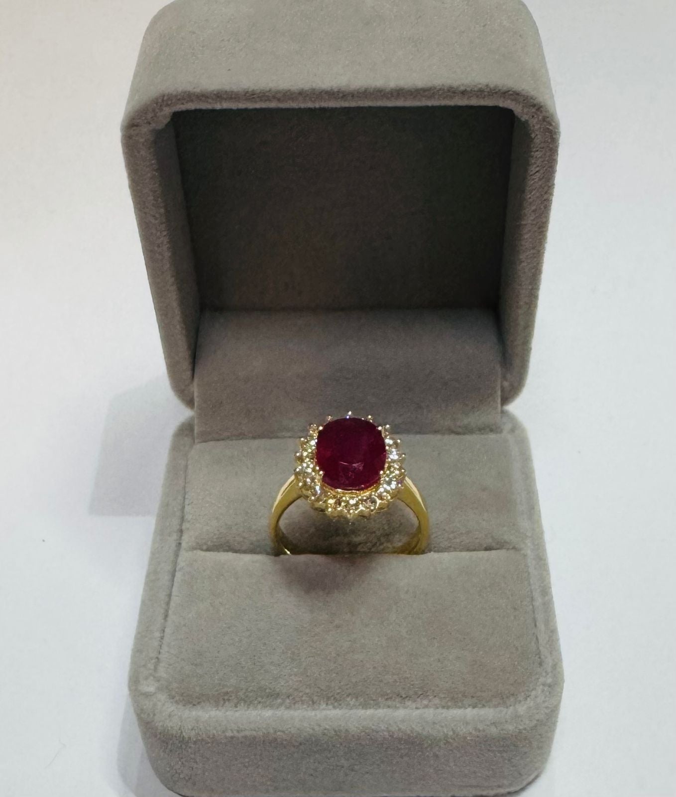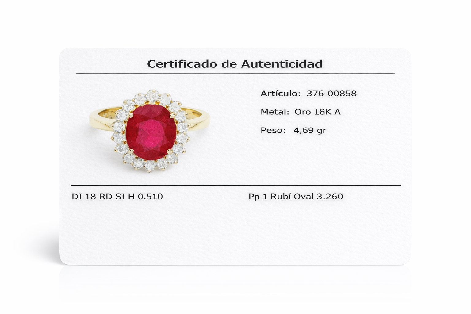 Diseñado en oro amarillo 18K, esta pieza presenta un imponente rubí oval de 3.260 ct como piedra central, reconocido por su intensidad cromática y simbolismo de amor y poder. El rubí está delicadamente enmarcado por un halo de 18 diamantes redondos, cuidadosamente seleccionados en calidad SI y color H, que amplifican su brillo y realzan su presencia con una luminosidad sofisticada.