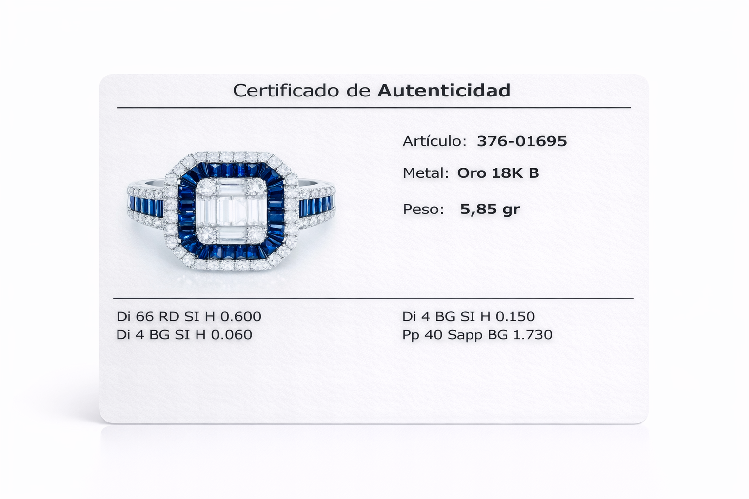 Montado en oro blanco 18K, este diseño resalta la pureza de las gemas y ofrece una presencia sólida y sofisticada gracias a su estructura de 5.85 gramos.