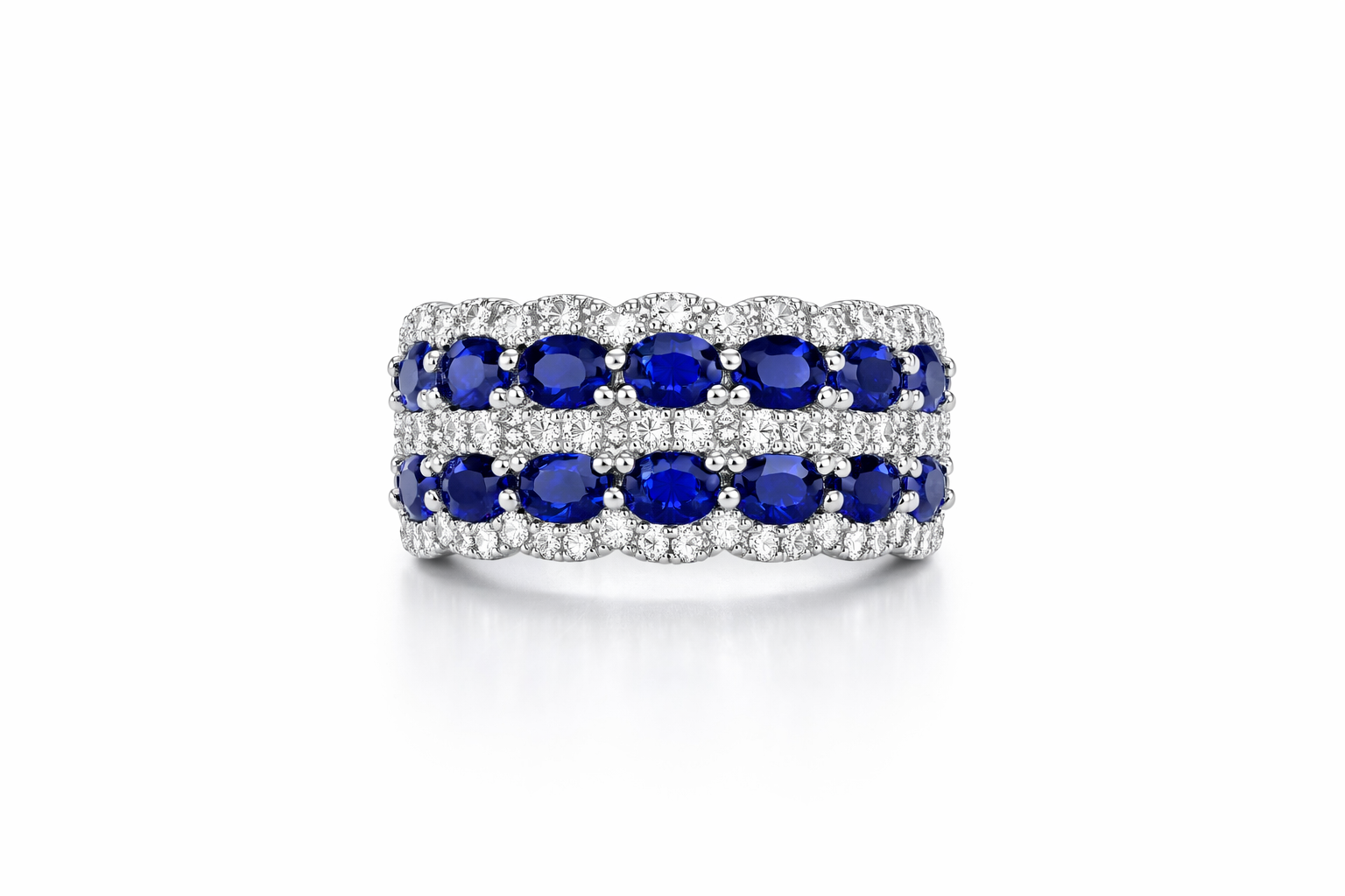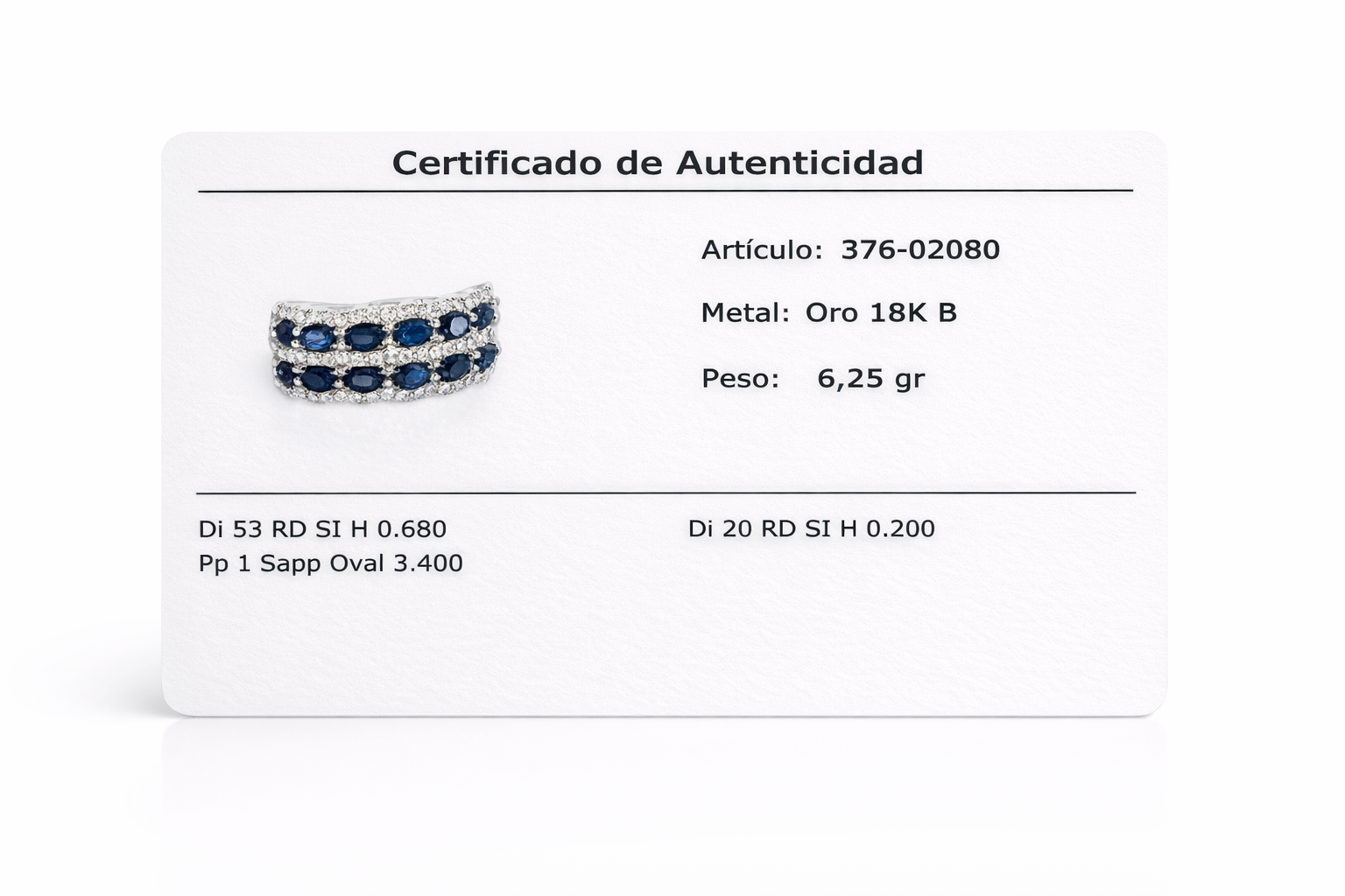 Este anillo de la colección PINETA 18K de BAUER redefine la elegancia con una estructura arquitectónica de gran presencia. Su diseño tipo banda ancha presenta una composición envolvente de zafiros oval de intenso azul profundo (3.400 ct totales), dispuestos en líneas paralelas que crean un efecto continuo de color vibrante.