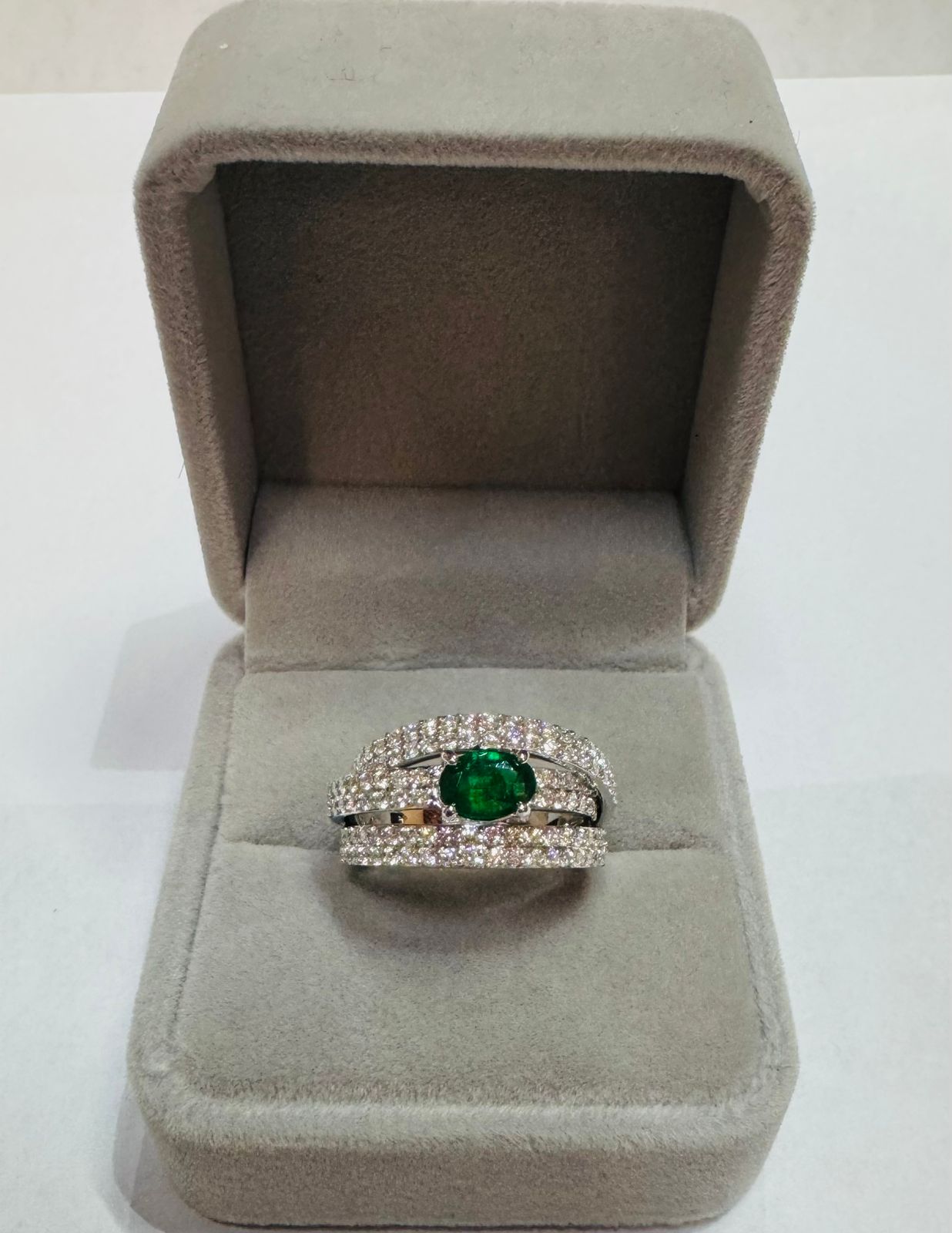 El contraste entre la intensidad de la esmeralda y la luminosidad de los diamantes convierte esta pieza en una joya protagonista, ideal como anillo de aniversario, pieza de colección o declaración de estilo.