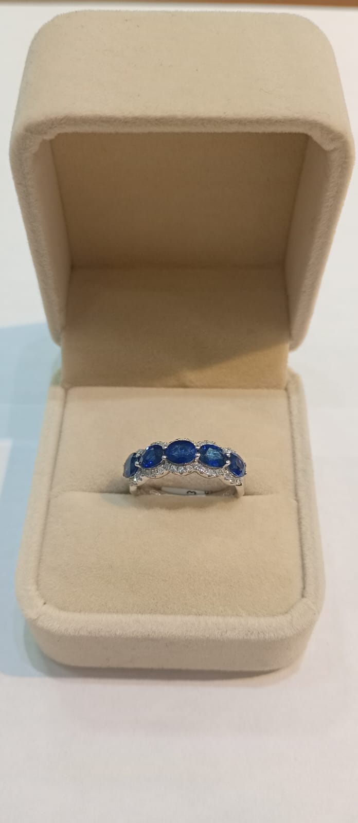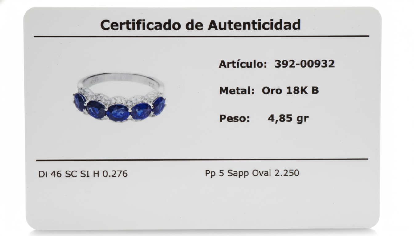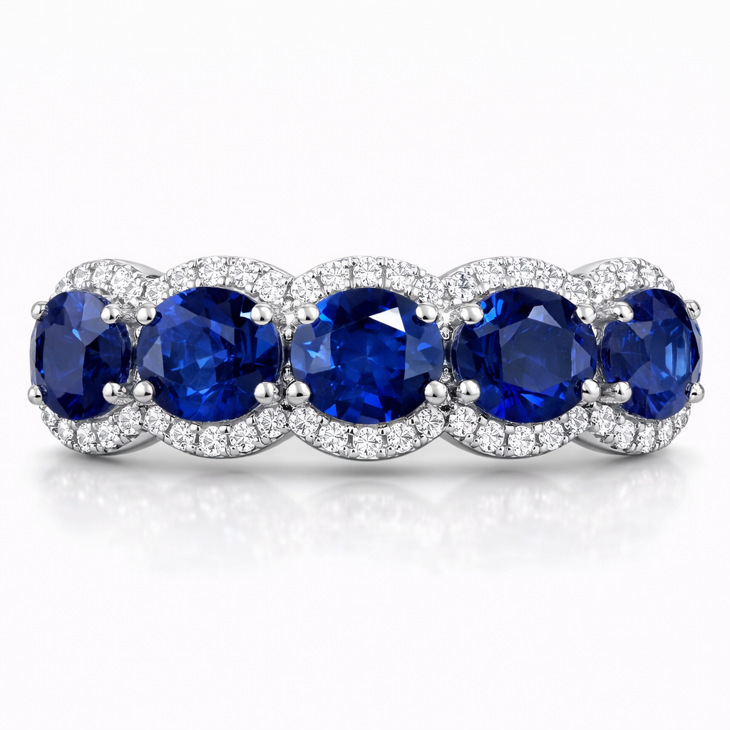 El diseño presenta una secuencia armoniosa de zafiros azules naturales de corte oval, cuidadosamente seleccionados por su intensidad de color y luminosidad. Cada gema se encuentra rodeada por un halo de diamantes naturales, generando un efecto visual de volumen, resplandor continuo y un refinado acabado artesanal.