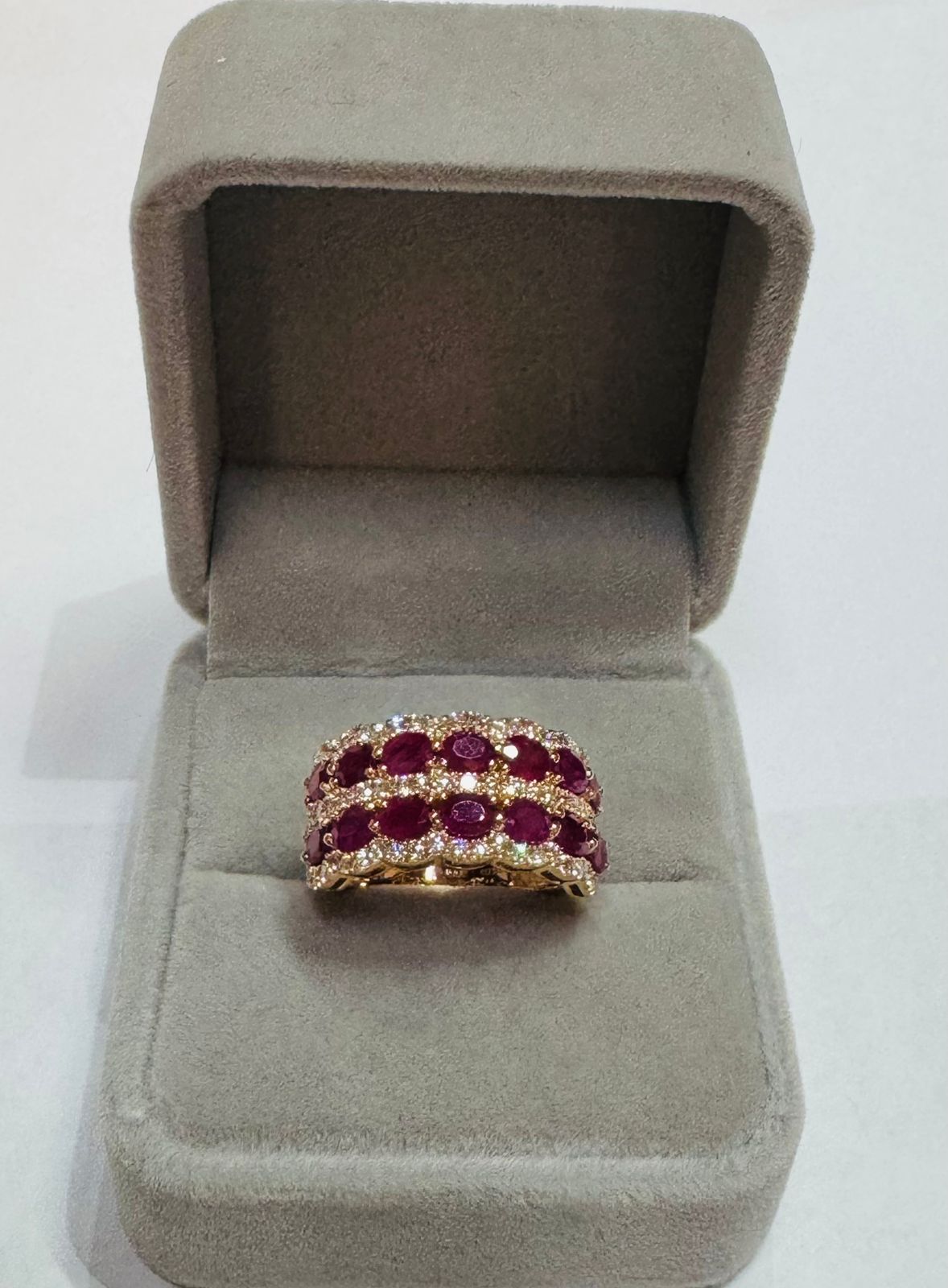 Anillo PINETA 18K en Oro Rosa con 14 Rubíes Oval y Diamantes – Banda Ancha de Alta Joyería