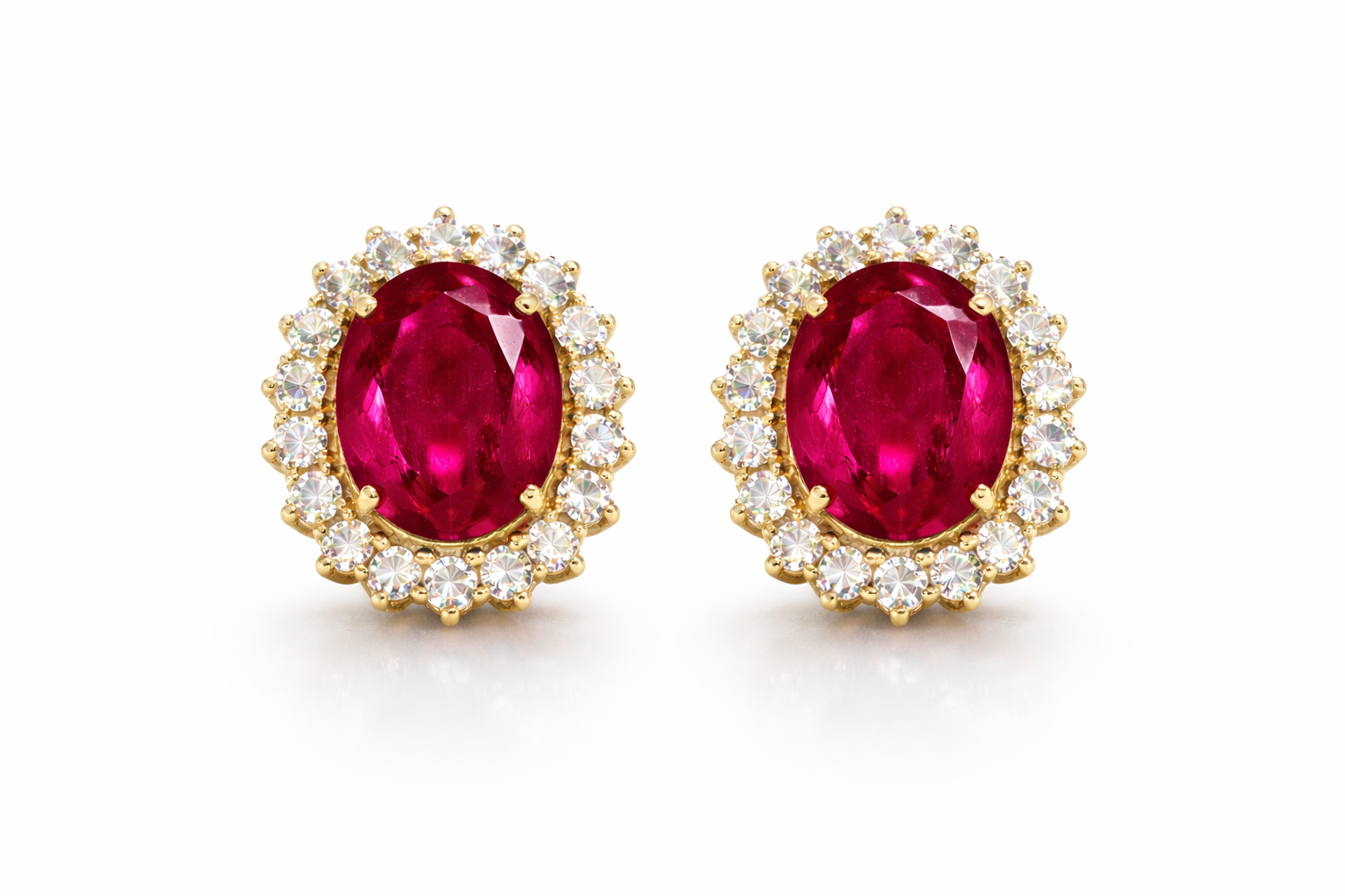 Aretes PINETA 18K con Rubíes Ovales y Halo de Diamantes en Oro Amarillo 18K