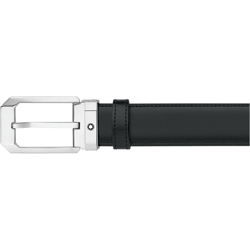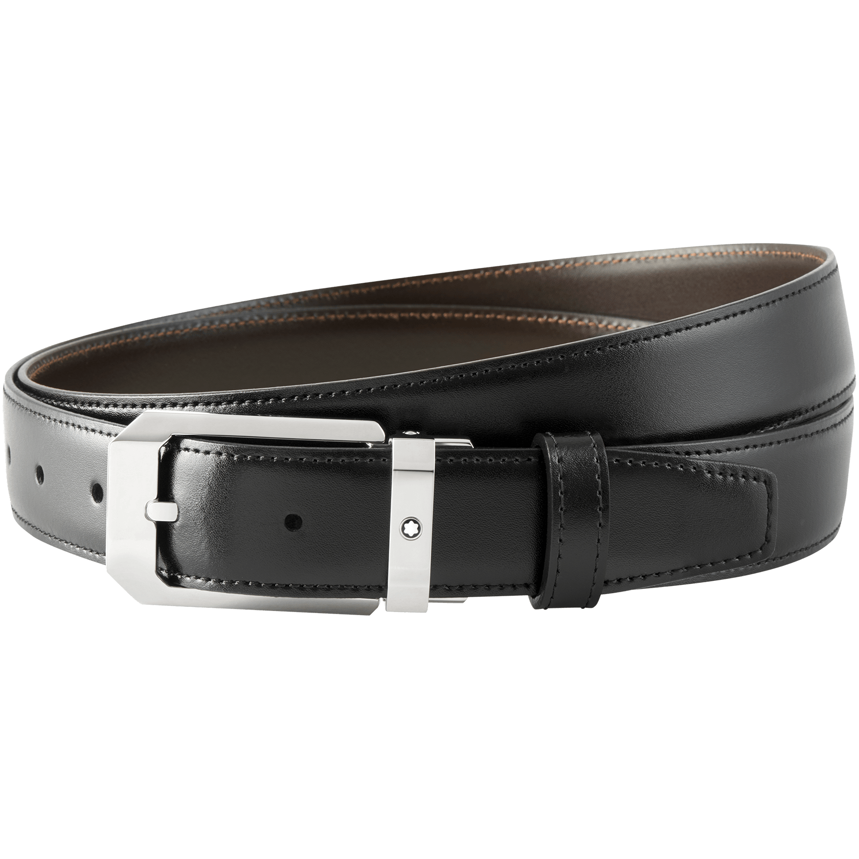 Cinturón ejecutivo y sofisticado Montblanc, diseñado para combinar con tu estilo sin esfuerzo. Hecho en piel de becerro reversible negro y marrón, ancho de 30 mm, longitud de 120 cm, y cierre clásico de hebilla rectangular en acero inoxidable brillante con el emblemático logo Montblanc. Tipo “self-adjustable”, perfecto para usar con trajes o looks más casuales.