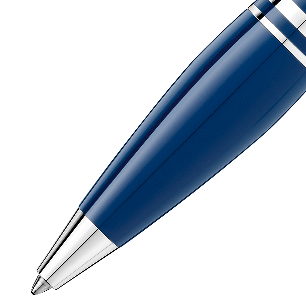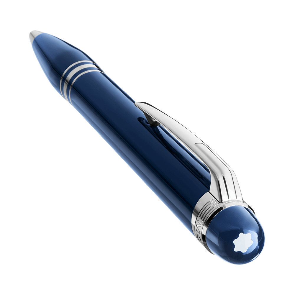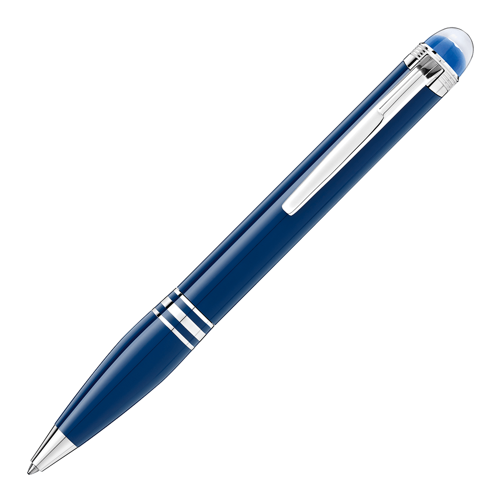 Un diseño sofisticado en resina preciosa azul con acabados platinados. Pertenece a la colección StarWalker Blue Planet y presenta el emblemático emblema con cúpula translúcida azul y estrella flotante, evocando el planeta visto desde la Luna