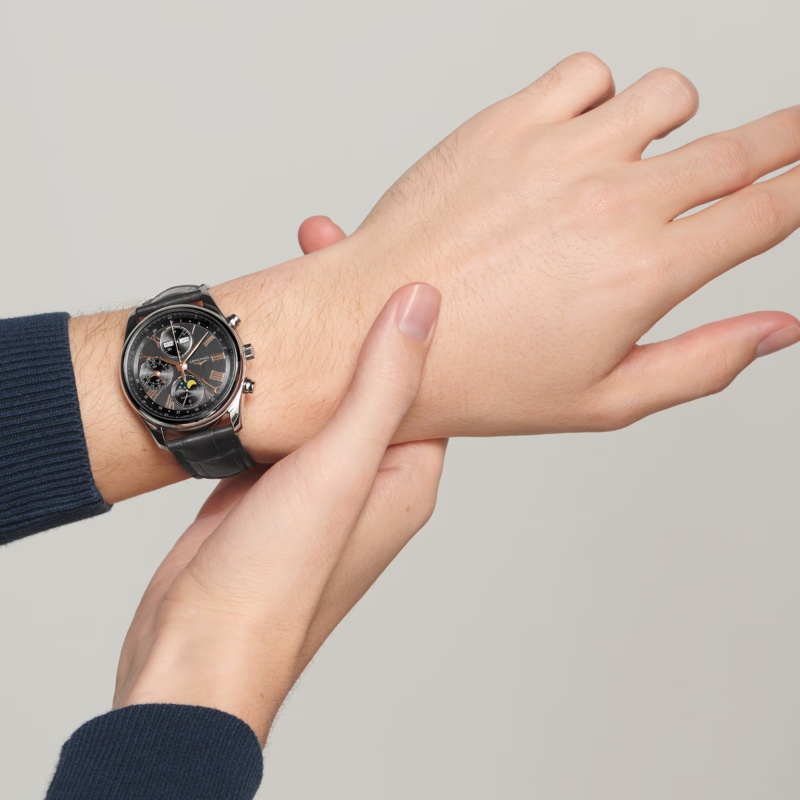 Función: Horas, minutos, segundero pequeño con indicador de 24 horas a las 9; fecha indicada por aguja central con forma de medialuna; fases de la luna a las 6