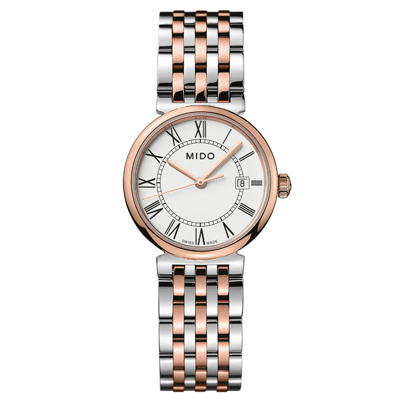 Dorada es una colección clásica de Mido para la mujer de estilo elegante, reloj de cuarzo en acero inoxidable con tratamiento PVD dorado, carátula blanca con número romanos que estilizan el reloj.