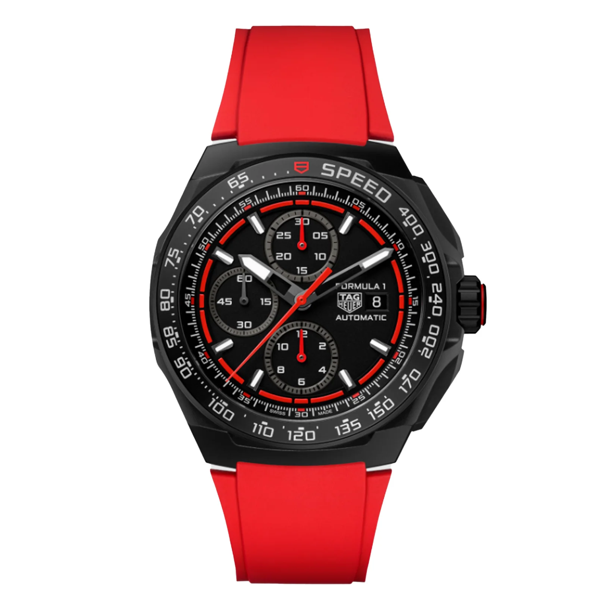 El Reloj TAG Heuer Formula 1 CBZ2085.FT8093 es un cronógrafo automático de 44 mm, con caja de titanio de grado 2 y detalles en rojo sobre esfera negra. Incorpora el confiable movimiento Calibre 16 con cronógrafo y ventana de fecha, resistente al agua hasta 200 m. Su diseño deportivo y ligero lo hace ideal para amantes de la velocidad que quieren un reloj potente y moderno.