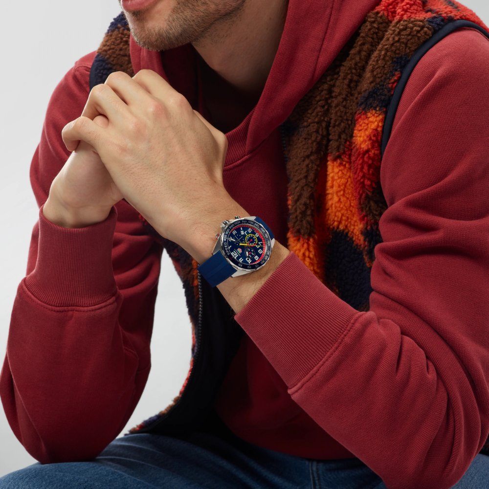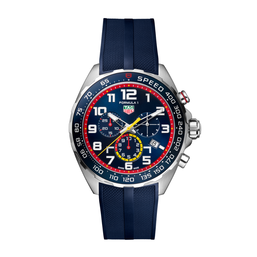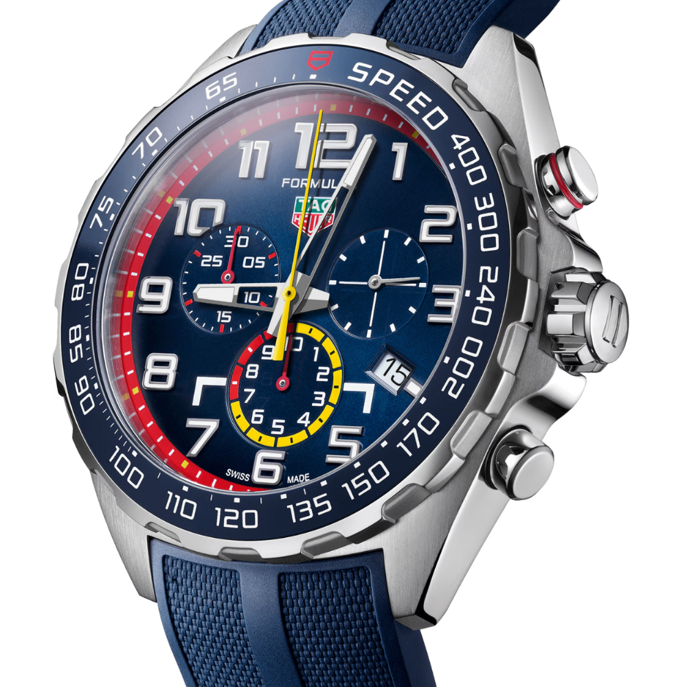 Acelere hasta la victoria con el TAG Heuer Formula 1 Red Bull Racing Special Edition. La estética deportiva y el diseño dinámico de esta colección exclusiva dan lugar a un cronógrafo preparado para la acción que marcará el paso a través de su homenaje a dos grandes líderes.